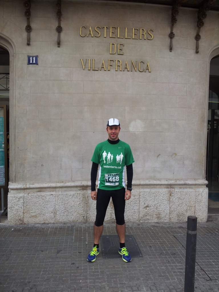 Me dirigí a la carrera sin ningún miembro de sedentaris.cat pero no fui solo, fui con tres compañeros de trabajo que también practican el running. Llegamos pronto a Vilafranca y encontramos aparcamiento justo delante del local de los Castellers de Vilafranca que es donde se recogían los dorsales y donde estaba el guardarropa. Nosotros ya teníamos el dorsal ya que uno de los compañeros nos lo recogió  el día anterior, así que nos dio tiempo a tomar un café. La carrera empezaba a las 11, un horario poco habitual pero se agradece por la temperatura.