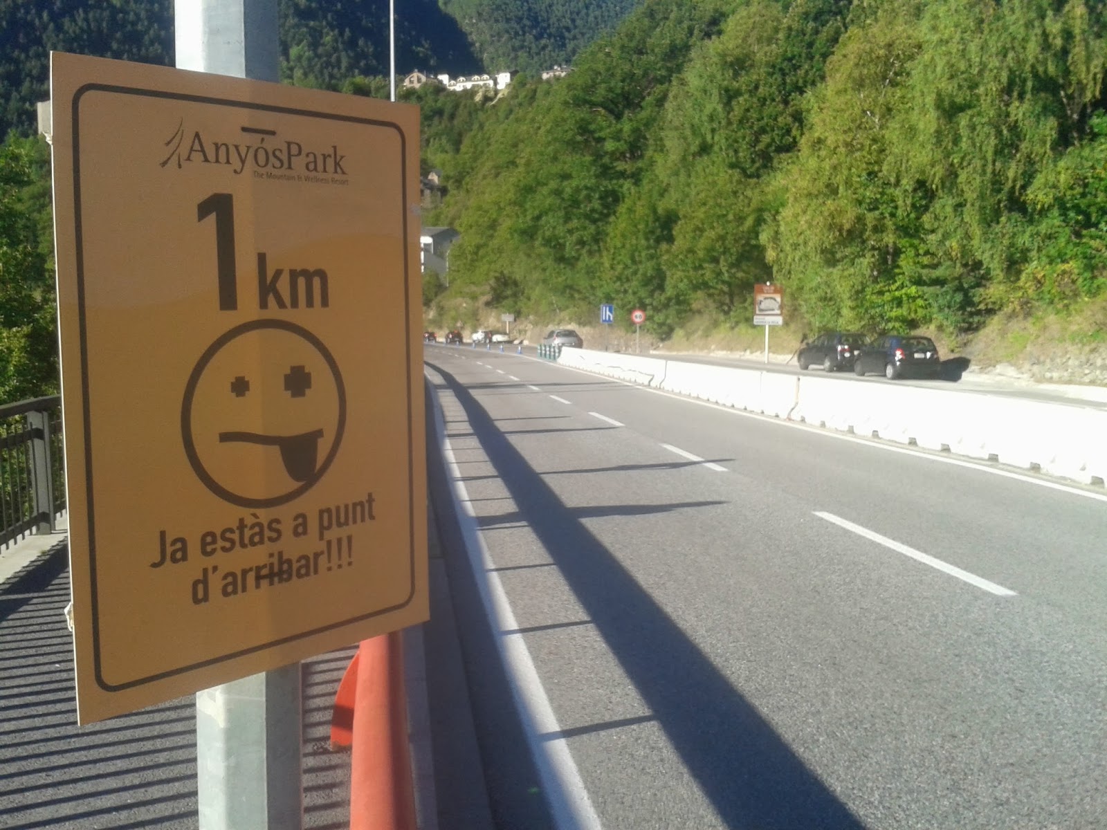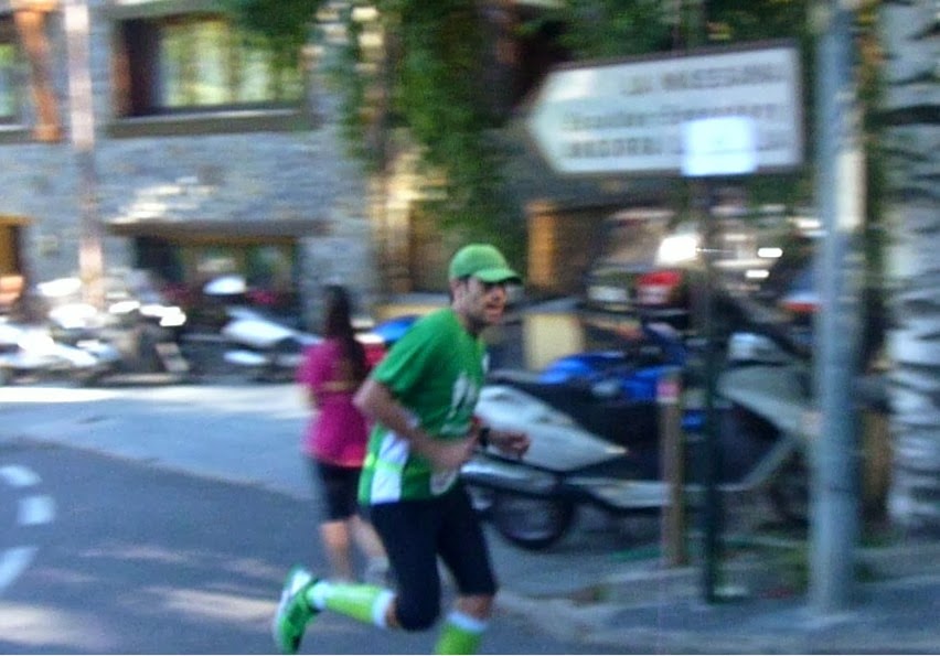 La bajada… que bien sienta! Voy con ritmo bueno porque paso a un par de corredores fácil y al poco a otro trío. El km 7 sale a 4’23». Se llega al telecabina donde hay algo más de público. Se agradece. Los avituallamientos de bajada los salto. No hace tanto calor y voy bien. Paso por el km 8 a 4’29» ya con un desnivel no tan favorable. Hay otra pareja delante pero no consigo recortarles. De hecho un chico de un club de Andorra se me une y me pasa en la zona de llano… hasta que de nuevo le paso temporalmente en la bajada pronunciada final. Justo antes estaba el paso por el km 9 que hago en 4’51».