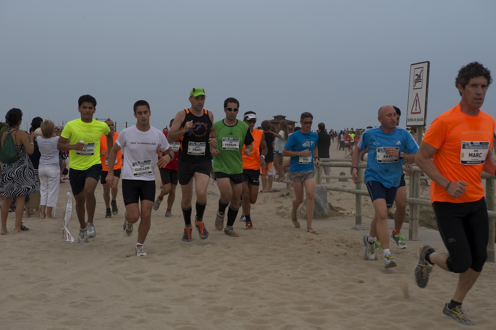 Hago una salida fuerte con Alejando y Ferran (Will se queda atrás) hasta llegar al primer km donde empezaba la realidad de la carrera… la arena! Ahí algunos se descalzaban. Giramos en dirección Sitges para volver hacia la salida. El ritmo lo marcaba la arena. Alejandro se aleja gracias a la buena forma que tiene con sus entrenos múltiples. Yo me quedo con Ferran. Pasamos a la altura de la salida donde se concentra nuestra afición.