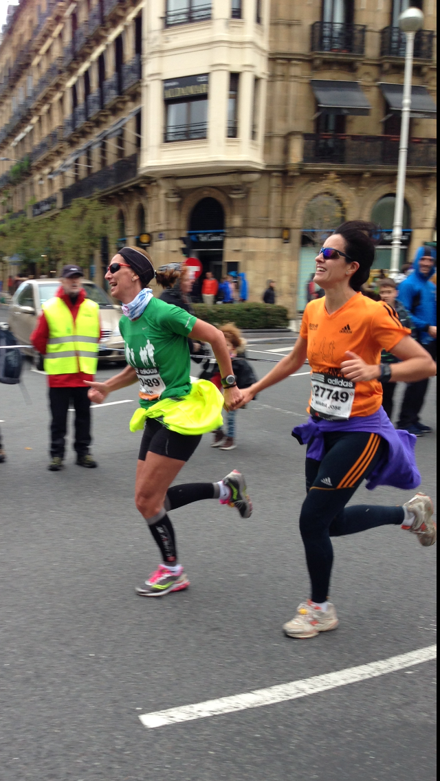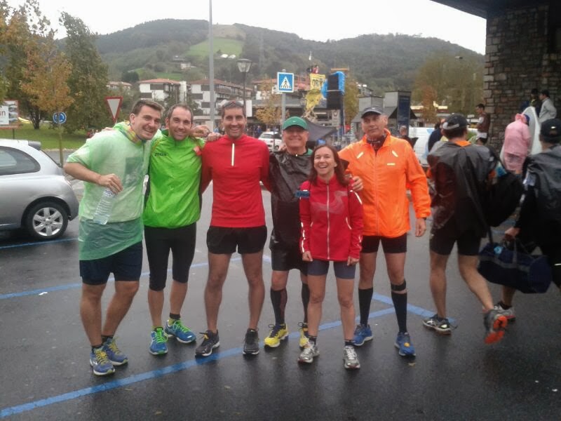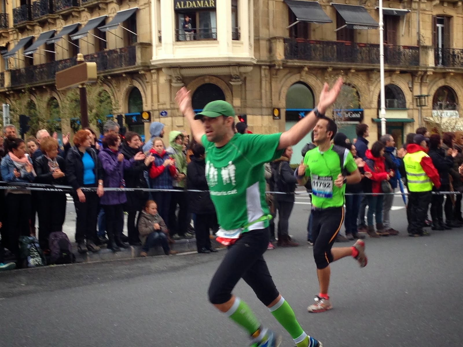 Salimos a la calle y un gran vendaval nos da la bienvenida. Al menos no llueve pero el viento es considerable. Caminamos hacia la estación de Amara pasando por el hotel a recoger a la familia Folqué. Esperamos fuera y casi se nos lleva el viento… tendremos que ponernos piedras en los bolsillos. Llegan. Continuamos el trayecto, comentando un poco sobre la carrera y de la previsión del tiempo. Que buen rollo hay en la calle.