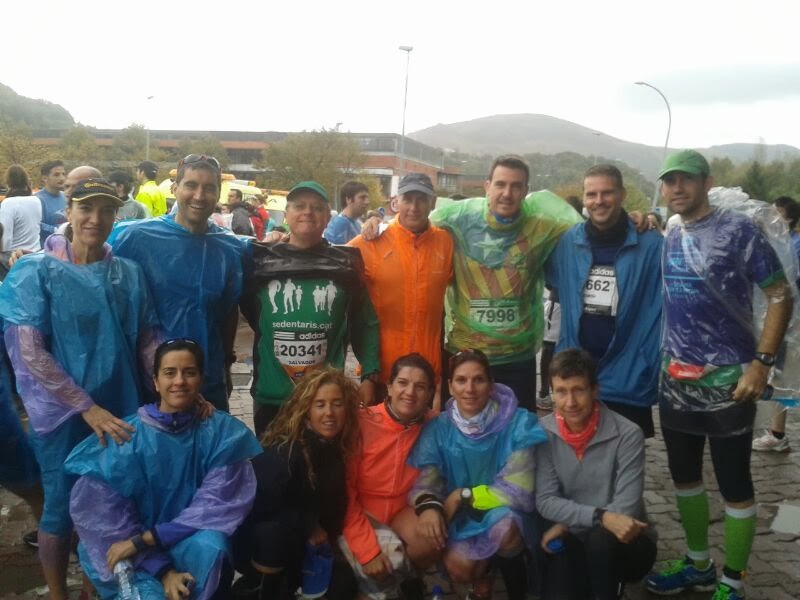 Voy a recoger medalla, la bolsa para abrigarme, algo de bebida y comida hasta llegar al punto de encuentro de la S… este año ha cambiado así que dudo si sabrá llegar la gente. Tardan, asi que me cambio y voy a ver a la afición que debían estar cerca. Los encuentro y me vuelvo a la S. Nos vamos reencontrando.