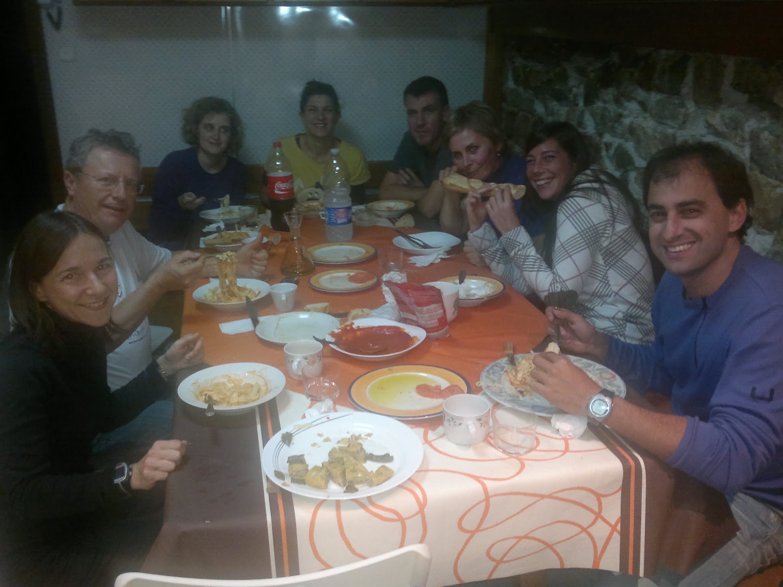 Por fin llego el dia de partir, así que principalmente en un par de coches el viernes mediodía pusimos rumbo a San Sebastian. Este año en la carrera participamos: Iñigo, Joan, Reyes, Pablo, Salvador, los Xavis y un servidor (Iñaki); mientras que de afición tuvimos a Bea, Ani, Eli y Esther. Casi 5h de trayecto, pero con mucho ánimo, unos cuantos whatsapp para entrar en ambiente y algo de lluvia. Al llegar a San Sebastian tocaba localizar el piso, dejar las cosas y cenar. Sobre el piso… enorme, muy céntrico, super cómodo y como única pega algo de ruido exterior… pero si buscas algo en el centro es lo que hay. La dueña super atenta y amable… hasta nos había preparado una tortilla de patatas, torrijas y queso. No daremos más detalles porque intentaremos repetir el año próximo :-p. La cena tras intentar reservar en una sidreria centrica, decidimos ir a la sidreria Calonge en Igeldo donde fuimos el año pasado, pudiendo degustar unos magníficos manjares con una atención perfecta.