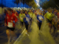 Un cop escalfats i amb una mica de voltaren al genolls (el lastre dels torrons i dels canelons no perdona…) ens vam anar situant als nostres calaixos. A dos quarts de sis, l’Hereu dóna la sortida. Una sortida lenta on vam passar pel detector de xips al cap de quatre o cinc minuts. La cursa comença a prop del mar i va seguint el litoral per la banda de dins de la Ronda Litoral. Tenim el mar a tocar… si no fos per la ronda… Arriba fins a l’estació de França on es comença a fer fosc. De moment força bé, el campió de l’estiu ja feia temps que no se’l veia… (va fer la seva segona cursa i va baixar de 48 minuts!). Després de passar per darrera del Parc de la Ciutadella enllacem amb Marina i cap amunt. Uns quants carrers més i anem a buscar la Diagonal amb la Torre Abgar tota il•luminada. I seguim… Jo anava amb la noia de la primera cursa, que va baixar de 59 minuts sense haver fet res abans… Doncs amb tot això ja és fosc del tot i el barri del Poble nou es volca a aplaudir els darrers quilòmetres. L’arribada era propera i només calia anar mantenint. Un esforç més fins al final i…. arribats!!!