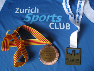 La mala mar del cap de setmana va fer que la part aquàtica es reduís lleugerament. El Jordi, el nedador del meu equip va fer un molt bon resultat. Després el Javier va donar-ho tot a la bici i em va passar el relleu, completant la prova amb un temps de 2:24:03. Això ens va permetre acabar el tercera posició entre els participants de la Zurich. A la medalla que donen a tots els Finishers, s’hi va unir la de Zurich amb una mini cerimònia al pòdium oficial. Crec que no ho veuré gaires cops més que pugi allà a recollir cap trofeu…