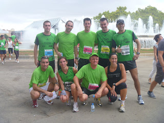 El grupo de sedentarios nos reunimos en el punto habitual de las carreras que salen desde Montjuic para hacernos la foto de rigor antes de la carrera… Manel, Joan, Anna, Salvador, Will, Marc, Ester, Iñaki, María Jose, Mariano, … Tras la foto calentamiento alrededor de la fuente mágica y a colocarnos en los cajones de salida. Esta vez, muy acertadamente, había varios cajones de color en función de los tiempos del chip amarillo… asi que no había opción para falsificar clasificaciones en papel (como pasa en Bomberos). Todo un acierto! En el cajón amarillo coincidimos Manel, Joan y un servidor, por tanto bien juntitos en la salida para hacer piña y táctica de equipo.
