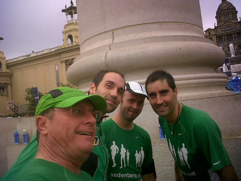 Día D: quedamos junto a la fuente de Montjuic, lado sedentario.  Alguno de los inscritos falla, por motivos diversos, pero casi cuesta encuadrarnos en la foto.