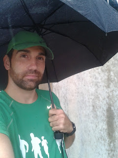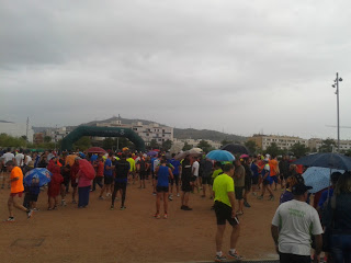 Luego fue el momento de los mayores, aunque esta vez yo solo puesto que Alejandro estaba en la etapa final de la recuperación de su lesión y debía mantener el reposo. Me quedo solo puesto que la lluvia continua, así que antes de la carrera que afrontaba sin ninguna presión me pongo a gestionar la logística de mi vuelta a casa con mi brother… Ahí ando bajo el paraguas con el móvil pasando los minutos haciendo tan solo unos pocos estiramientos para calentar hasta que dan el pistoletazo de salida y yo sin estar preparado… pongo el gps en marcha a buscar satélite, cierro el paraguas y lo dejo en un lado y cuando ya habían salido casi todos me pongo a correr.