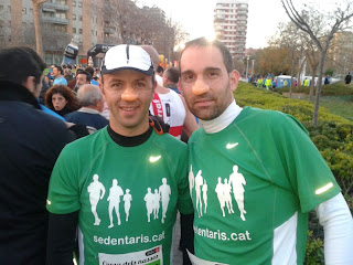 De forma un poco descoordinada (esta vez no habíamos establecido nada, ya que teníamos la tienda de RW como referencia de cada año) fuimos llegando los sedentarios. En total participamos: Iñigo, Anna, Andreu, Alejandro y un servidor (Iñaki). En RW nos encontramos algunos y también coincidimos con nuestros compañeros de entreno. A pesar del gentío también encontramos a otros conocidos como Javi, Ivonne y Tono (COR) que participaban en la carrera. Tras conseguir nuestros dorsales de Anna, foto, calentamiento rápido y a los cajones.