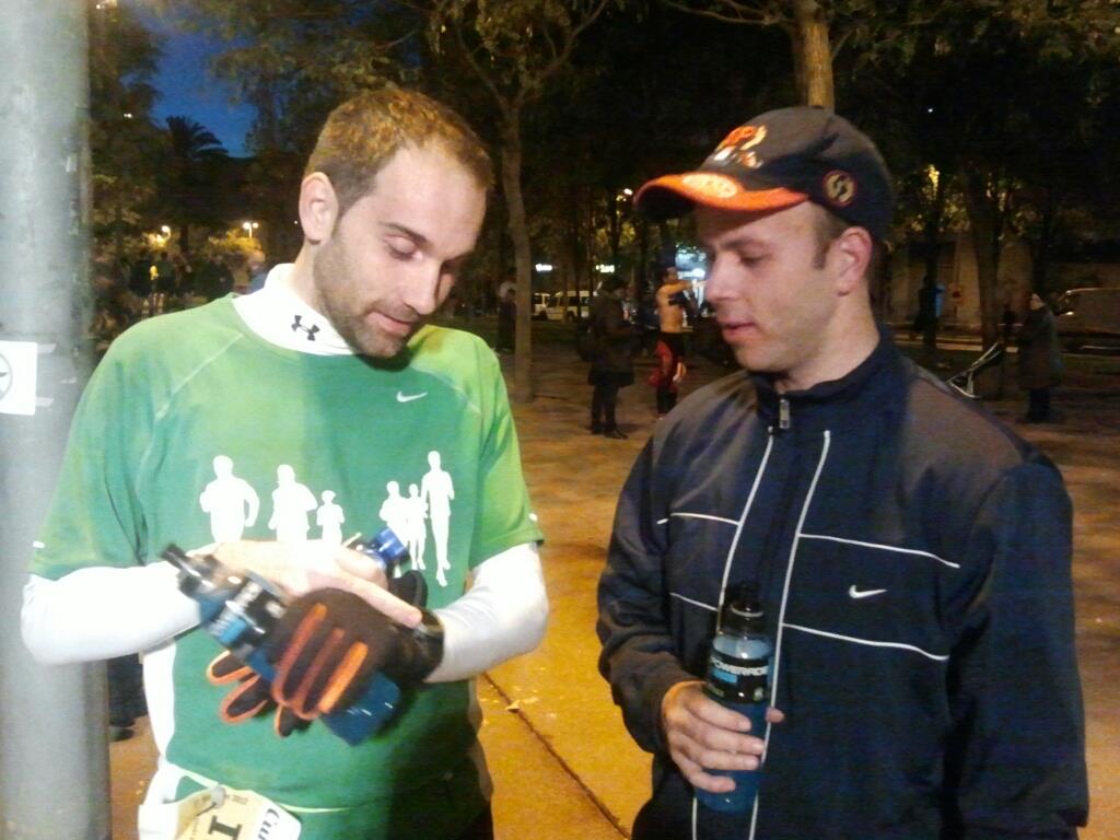 De forma un poco descoordinada (esta vez no habíamos establecido nada, ya que teníamos la tienda de RW como referencia de cada año) fuimos llegando los sedentarios. En total participamos: Iñigo, Anna, Andreu, Alejandro y un servidor (Iñaki). En RW nos encontramos algunos y también coincidimos con nuestros compañeros de entreno. A pesar del gentío también encontramos a otros conocidos como Javi, Ivonne y Tono (COR) que participaban en la carrera. Tras conseguir nuestros dorsales de Anna, foto, calentamiento rápido y a los cajones.