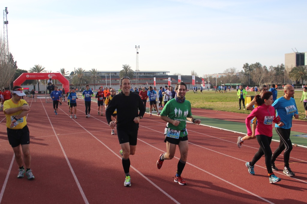 El día era muy bueno, fresco, pero se veía que no haría nada de frío así que dejamos térmicas y bolsas y empezamos a calentar dando vueltas al estadio de atletismo. No había mucha gente pero había buen ambiente. Nos cruzamos con Arcadi Alibes y su tropa de seguidores. Xavi V. decidió sacar su nueva y flamante cámara CANON con trescientos filtros y empezó a hacer fotos: «vosotros correr, no miréis a la cámara que no queda profesional».