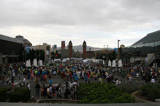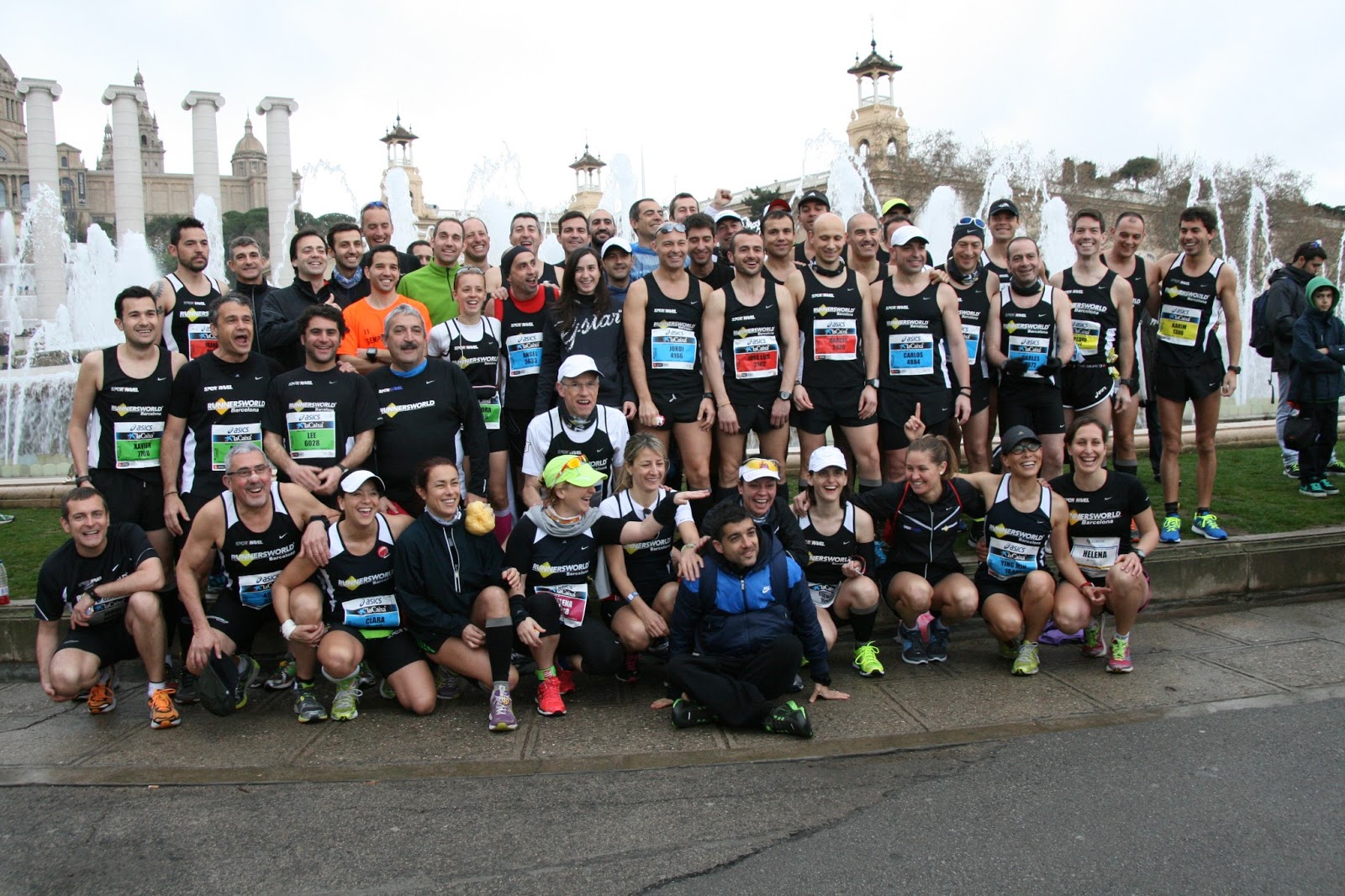Seguimos el camino a pie hasta el punto de encuentro. Reyes y Joan ya están por la zona. Vamos viendo a cada vez más runners. Algunos incluso ya trotan… desgaste innecesario a falta de 1h para empezar pensamos. En la recta de Maria Cristina vemos a la legión de africanos calentando… será el único momento que los veamos. Menudos galgos! Pronto llegamos a la fuente mágica al punto de encuentro habitual de sedentarios. La mayoría ya esta allí, junto con gente del COR. Empiezan los saludos, los comentarios, los nervios, … y las fotos de grupo. Hacemos varias fotos porque es difícil coincidir todos.