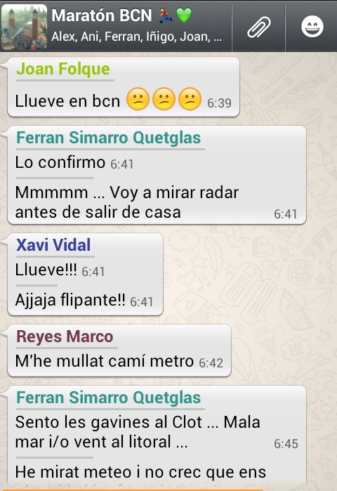 Con puntualidad británica me avisa Xavi V. que esta esperando. No estoy acostumbrado a esa puntualidad con otros sedentarios y el problema del ascensor me ha retrasado unos minutos. Bajo junto con Eli y nos dirigimos al coche. Vamos comentando sobre los mensajes, la lluvia, las sensaciones. También debuta, así que esta en una nube igual que yo. También comentamos sobre el pastel by Kilian Jornet que envió la foto el día anterior… inicialmente pensábamos que era un pastel normal. Con el coche vamos viendo a maratonianos caminando hacia plaza España. Aparcamos en una distancia prudencial gracias a la vista de Xavi.