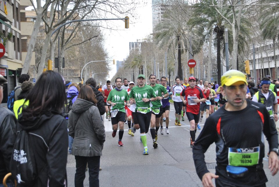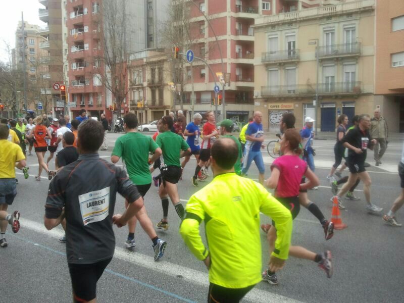 Bajamos hasta la Gran Via. Me acuerdo de esta zona en la mitja de Barcelona. Es una zona aburrida. Nos vamos fijando en los corredores que adelantamos y nos adelantan. Es una forma de entretener a la mente y así comentamos entre los cuatro.