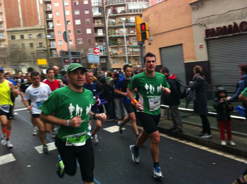Al poco llega con nosotros Joan. Nos informa que Manel continua, pero que va haciendo tramos corriendo y tramos andando. Él de esta forma no podría seguir y se ha pegado un buen calenton para llegar hasta nosotros. Llegamos a Plaza Catalunya y el tramo de falso llano se acaba, toca bajar… pero las fuerzas ya no acompañan como pensaba y el ritmo es superior al previsto. El muro también ha llegado para mi? Parece que sí, pero parece solo una tachuela porque el ritmo no es tan malo… voy a 5’25″/km.