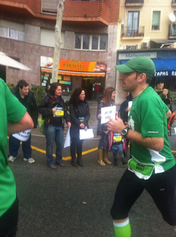Llegamos al final de la subida donde de nuevo se acumulaba gran cantidad de público. Ferran se adelanta para de nuevo para a por otro bidón… que droga se estará tomando? Al fondo veo los globos verdes por los que me pegué la caminata el día anterior… 🙂 por tanto ya esta Eli con Martina y Esmeralda. El giro coincide con otro avituallamiento… menudo lumbreras el que puso justo ahí el avituallamiento! Mientras bebo con el vaso veo rápidamente a la familia. También esta Bea que me grita y parece que también mi madre unos metros más adelante. El pasillo de paso de los corredores es pequeño por el público así que ni siquiera hago el intento de parar.