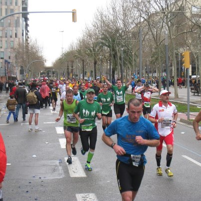Vuelta y bajamos la Diagonal. Nos reagrupamos de nuevo. Al poco veo a Anna que nos anima con entusiasmo. Esta preparada de runner para hacer de liebre a Xavi. También de refilón veo a Vanesa que espera Gaby que también debuta en un maratón. Coincidimos en un crucero de vacaciones. Me echa serpentinas… esta bien equipada para animar 🙂