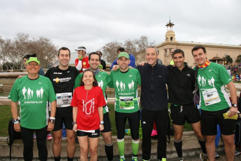 Bajamos al punto de encuentro, junto a la fuente. Están todos menos Xavi O. Hacemos un par de fotos. Bueno ellos más, pero yo estoy interesada en la cola del pipidromo. Cola lenta donde las haya. Cuando estoy lista ya no están, en el otro lado de la fuente tampoco. Pues nada, otra vez los he perdido. Preparo diez minutos: calentar (trote, skipping, sprints) y estirar (isquios, soleo, cuádriceps, gemelos…). Entro en el cajón que me corresponde e intento ver si los sedentaris pasan por allí. Y… ¡bingo! Los Xavis. Vamos a tomar juntos la salida. Después ellos harán su carrera, yo la mía. Nos movemos despacio y finalmente pisamos la alfombra roja (¿roja?).