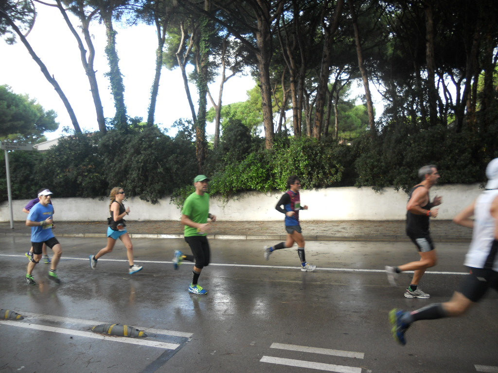 Salida complicada con varios charcos grandes (no hubiera costado nada a la organización intentar minimizarlos ya que era dentro del canal). Tengo cerca a la liebre de 1h 45′ que ha salido delante mio, por lo que la consigo pasar aprovechando para saludar a Maite. Cerca del km me adelantan Alberto y Tono del COR, que van a por un ambicioso 1h 35’… los dejo marchar. Los km van pasando en dirección al paseo marítimo de Gava, y el ritmo que llevo es bueno, unos segundos por debajo de la idea inicial. El paso por el km 5 es en 24′. Ya en la zona del paseo marítimo se notaba el aire, asi que iba buscando espaldas anchas en las que protegerme :-). Justo antes del giro hacia el canal estaba Manel dando ánimos (gracias!) y Ani haciendo fotos.