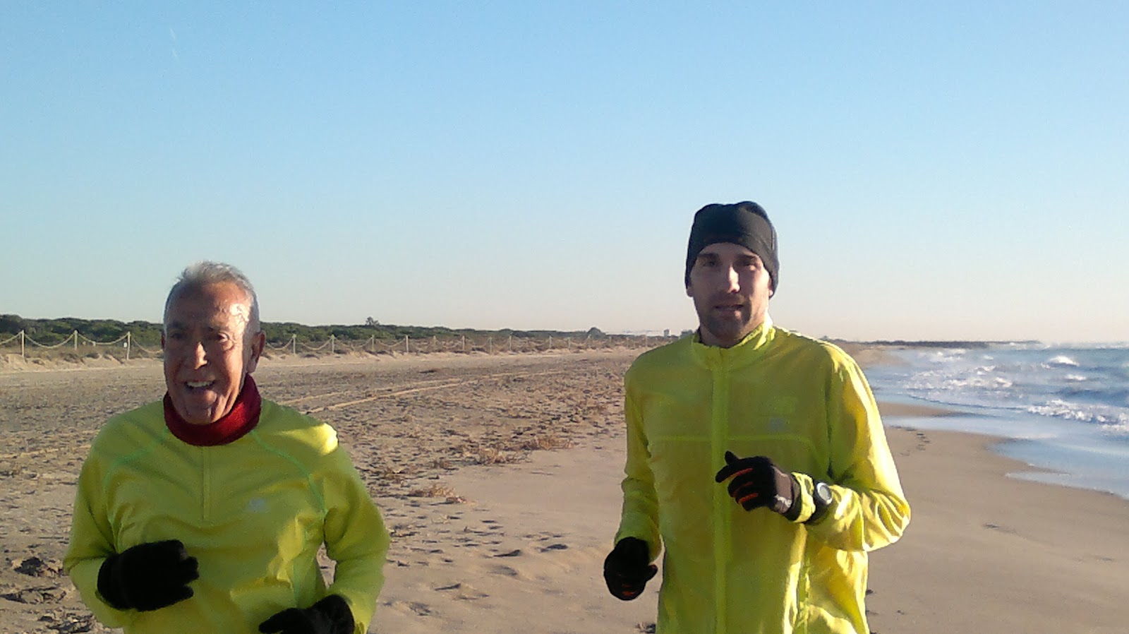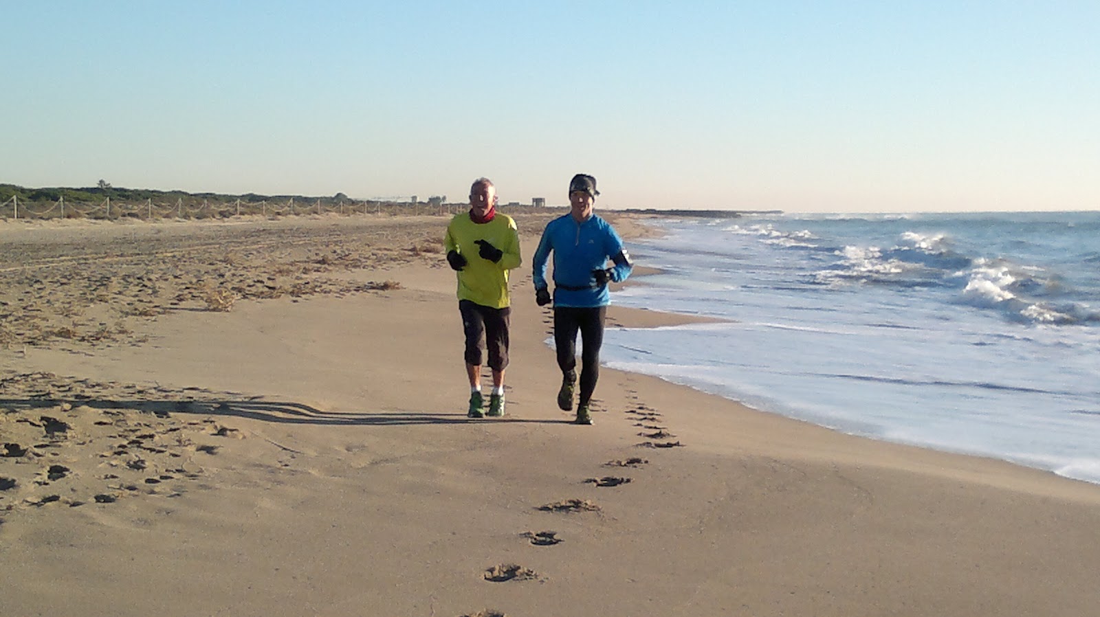 El circuito sigue por el camino que va a la playa de El Prat (al revés de como se hace en la carrera popular de esta población), pasando junto al cementerio y los puntos de visualización de las pistas del aeropuerto. Este camino es muy recomendable para entrenar, ya que es completamente llano y tiene camino de arena en buenas condiciones para no castigar nuestras articulaciones. Además con las vistas de los aterrizajes o despegues de los aviones desde muy cerca. Se llega hasta la playa, y ahí por el camino de madera continuamos en dirección Castelldefels. Al finalizar el paseo marítimo encontraremos una pasarela para cruzar la desembocadura de una riera… y a partir de ahí empieza el tramo más duro del recorrido: 3K por la arena de la playa! Las vistas son espectaculares puesto vamos en paralelo al mar y parque natural del Delta / Remolar… menos mal que nos aprovechamos de la arena compacta por las rodadas de algún 4×4 de los vigilantes del parque.