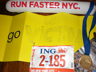 els últims tres ha estat molt xulo per Central Park..la gent cridant, animant, de tot!!!llàstima que el dolor que tenia a les cames era massa gran com per somriure a les fotos, jejejeje…però ja arribats allà sabia que ja l’acabava, tot i que amb dolor, i amb bon temps!! A la última milla, la última trobada amb la Laia i l’esprint final!!!bueno, esprint és un dir..anava coix perdut de rampes!jajaja. Al creuar la meta, us juro que quasi ploro entre emoció i dolor. I m’han penjat la meva medalla de finisher. Quin record. Realment crec que s’ha de tenir un llindar del patiment bastant alt per fer això!!