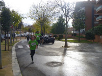 Paso por delante de casa y ahí esta mi madre cámara en mano :-). Aquí escucho que mi hermano me sigue de cerca porque le escucho llamar a Mandy, así que pienso que va a tocar apretar para seguir delante. Tras un giro, vuelve el desnivel plano para continuar en bajada para devolver los metros que habíamos subido. El paso por el km a 4:45 y paso por el km 3 a 4:26 (se nota que en este km mayoritariamente bajabamos).
