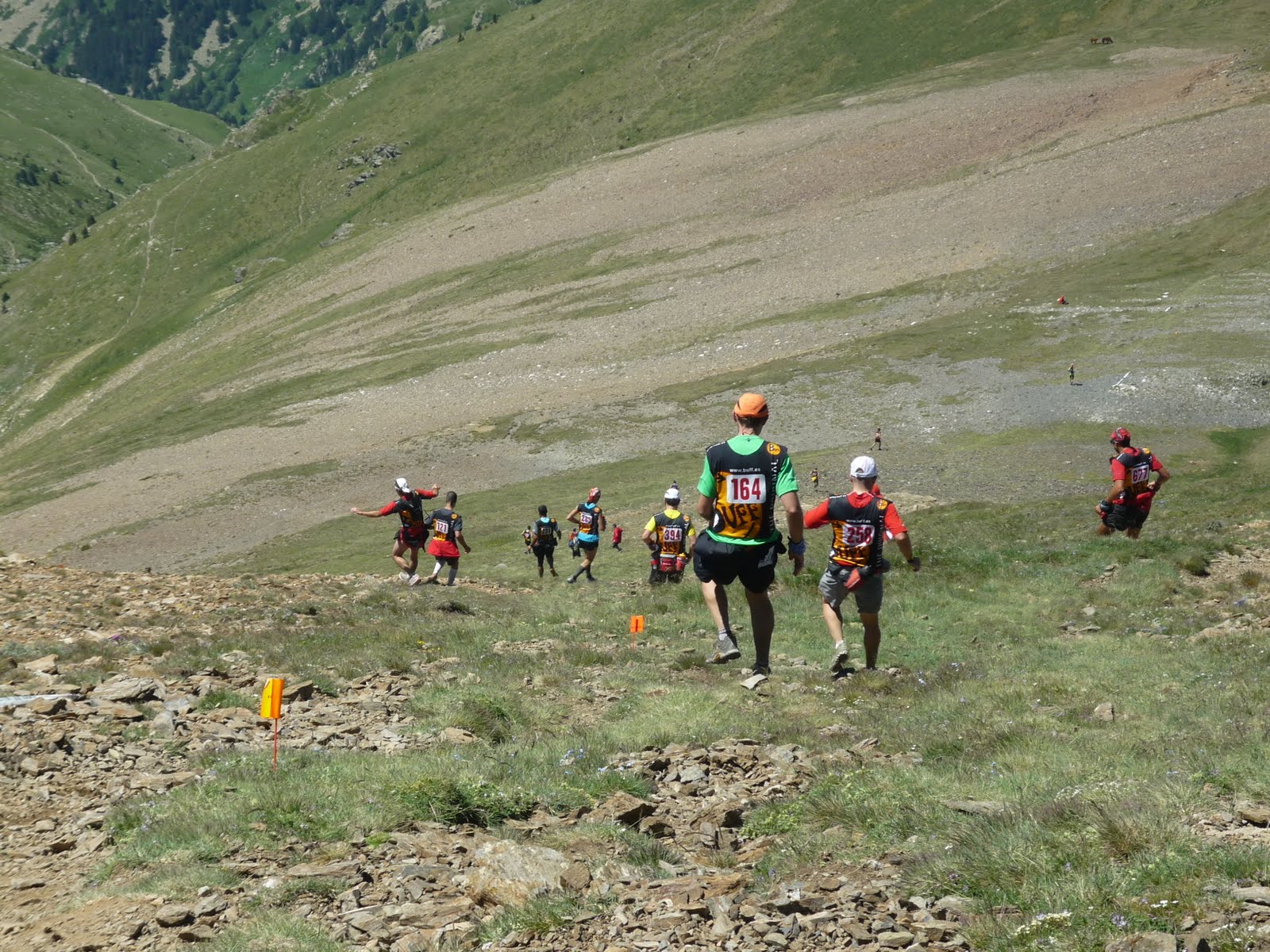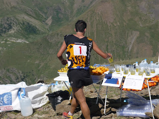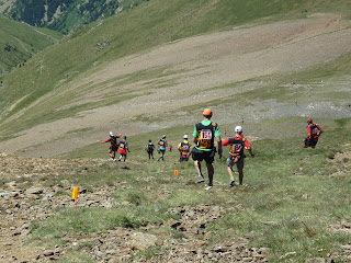El recorregut es força «trenca-cames», les pujades ja no són tan fortes però els quilòmetres van passant i ja tens ganes d’arribar al final. Per sort els avituallaments estan molt bé i mira que la logística (amb helicòpter imagino) per portar beguda a 2800 o 2900 metres no ha de ser gens fàcil. En una mica menys de 4 hores vaig arribar a l’últim control, on hi havia la Maria i la Lina (gràcies a elles tenim aquestes fotografies). Com que van fer l’esforç de pujar fins allà dalt doncs m’hi vaig quedar uns minuts i … cap avall!